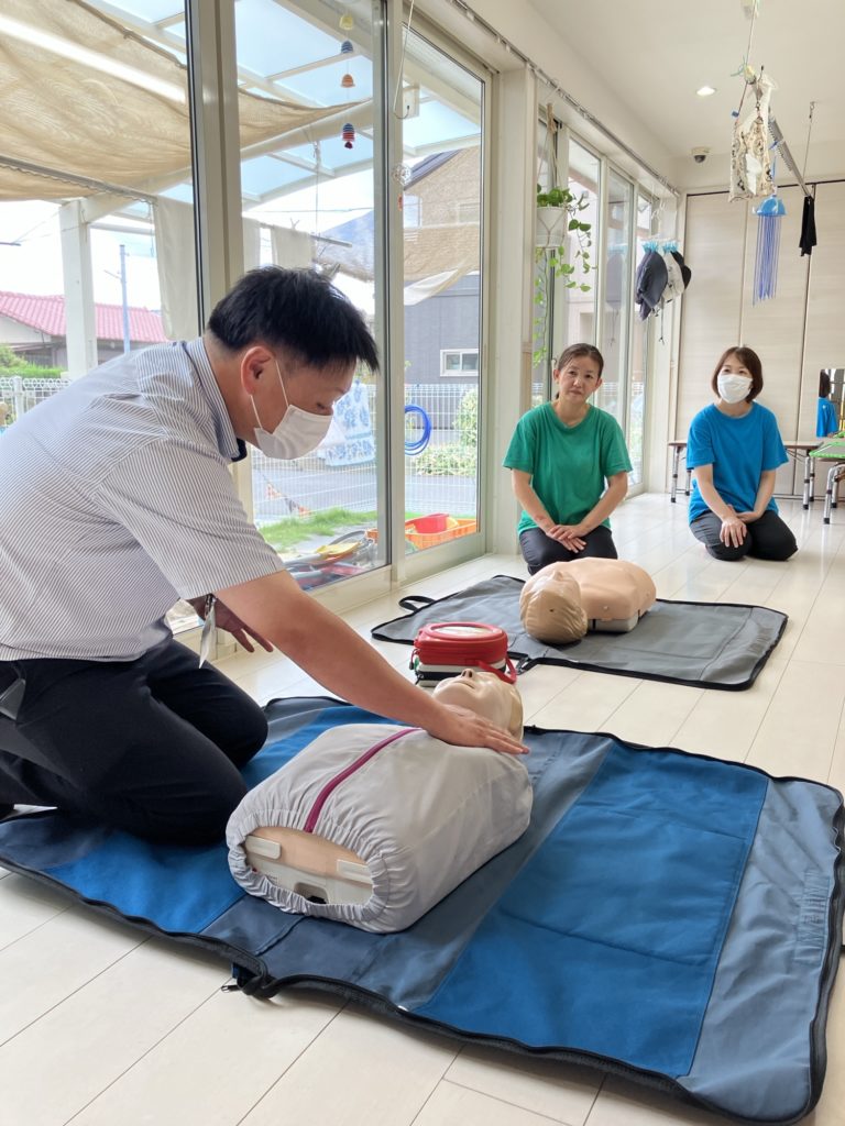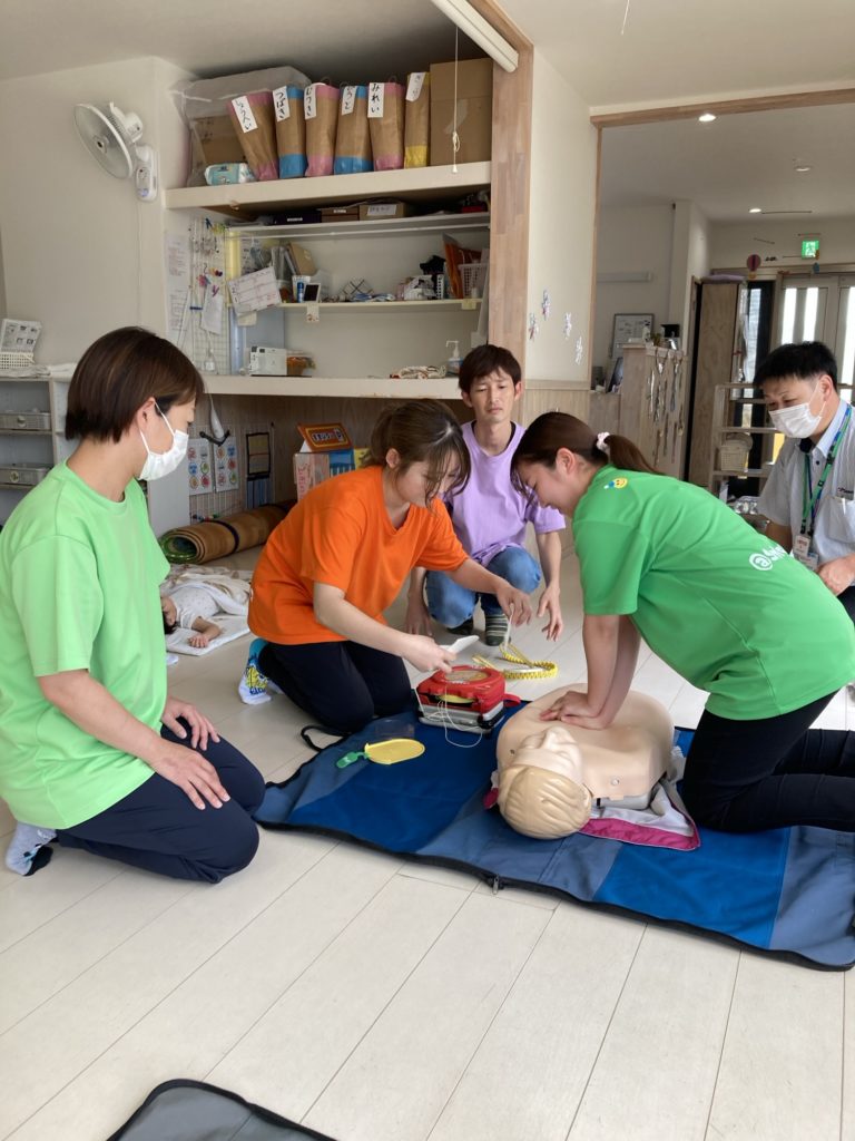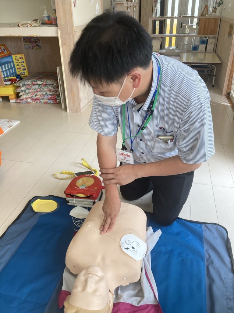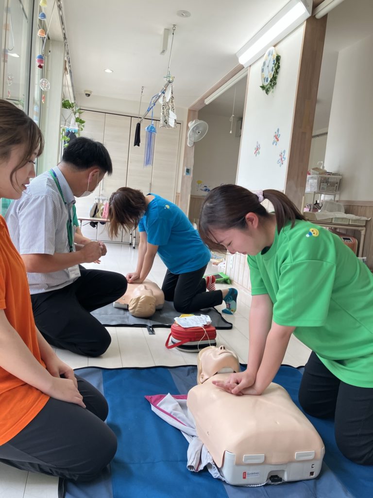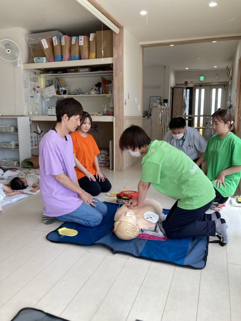 小さな身体に圧をかけるのはとても抵抗がありますので、蘇生を行わないでいいように、日頃から子ども達の顔色、声色、呼吸などの変化を見落とさないようにかかわりながら過ごしていきたいと思います。